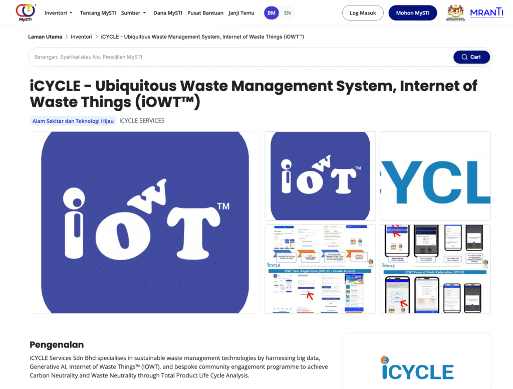 iCYCLE is recognised by Malaysian Science, Technology and Innovation Information Centre (MySTI) for its integrated, technology-driven approach to sustainable waste management. It is formally accredited as a company that leverages big data, Generative AI, and the Internet of Things (IOT) to deliver customised community engagement programmes through full product life cycle analysis — supporting measurable progress towards carbon neutrality and zero-waste outcomes.